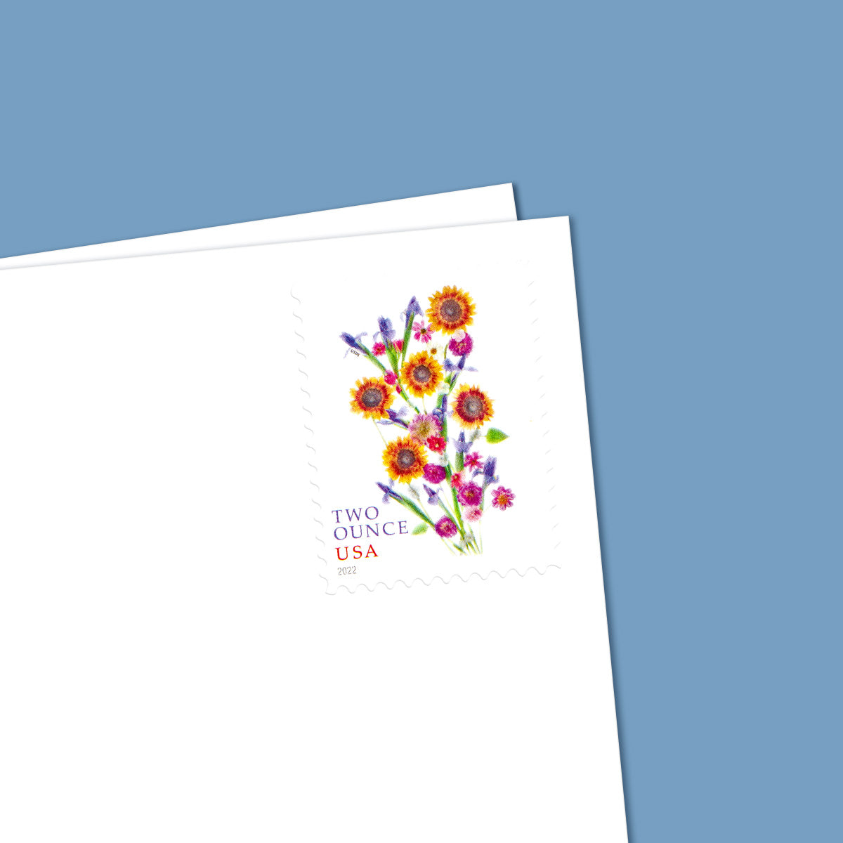 This new stamp features five sunflowers as part of a bright and beautiful bouquet. As a two-ounce stamp. Sunflower Bouquet can accommodate the weight of heavy invitations for birthdays. weddings. anniversaries. and other celebrations; oversized greeting cards; and mailings such as small gifts that require extra postage